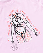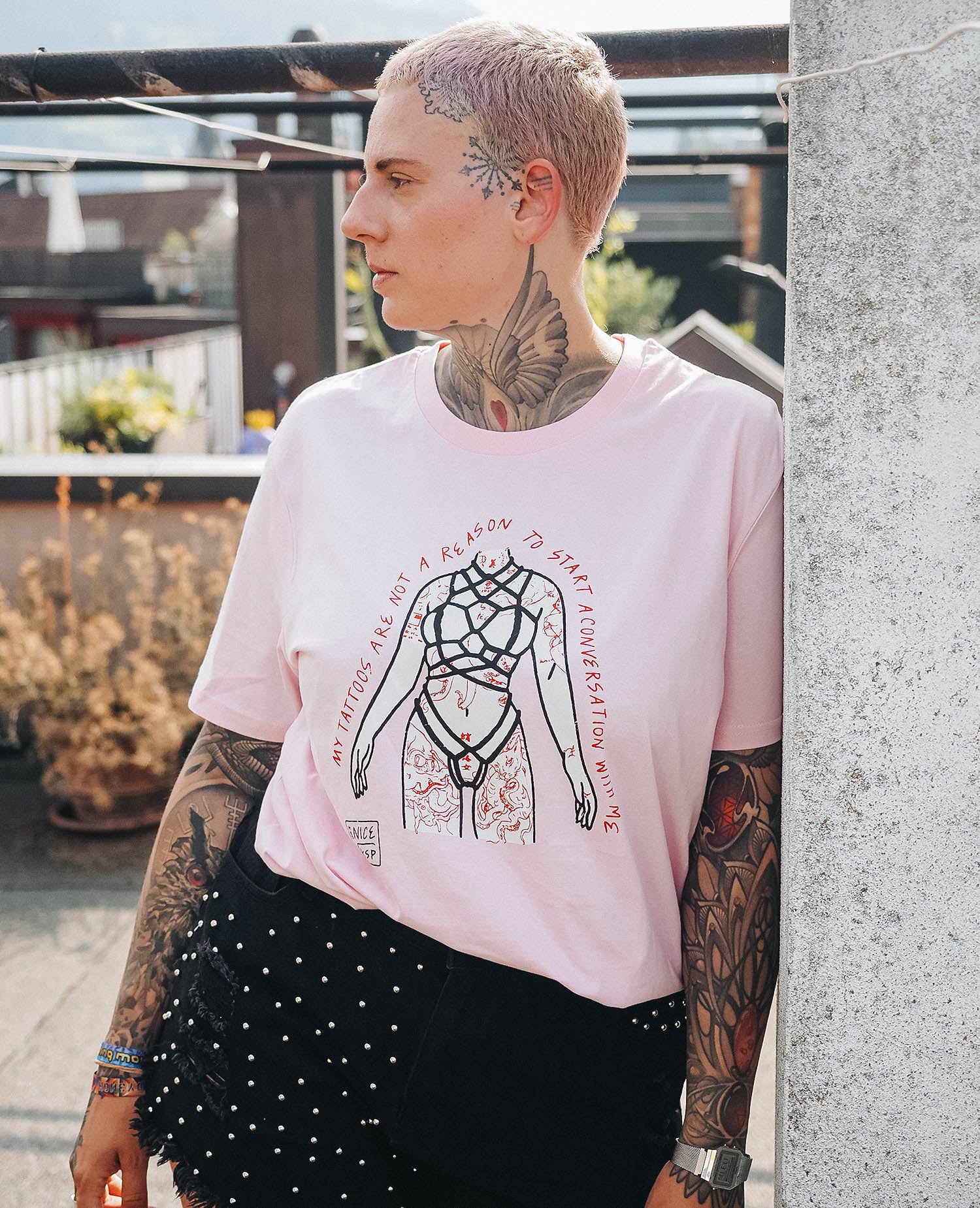 Wir sind stolz darauf unsere erste gemeinsame Kollektion mit unserer Freundin Mrs. Nice, ein kinky Weirdo, Adult Content Creator und liebevolle Vertraute für romantische Angelegenheiten vorzustellen. Die Kollektion ist von ihren Leidenschaften Shibari & Tattoos inspiriert und verkörpert den Sinn von Selbstbestimmung, Offenheit & Sexualität.Die vertrauten T-Shirts von NKSP haben den Mrs. Nice Touch, mit Hand-illustrierten Grafiken und schamlos direkten Statements.